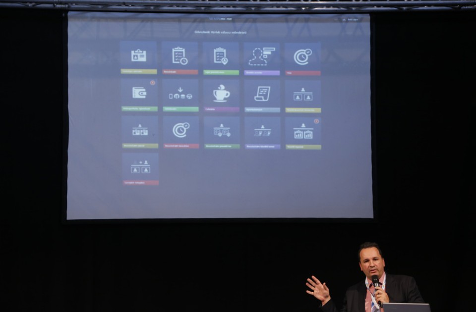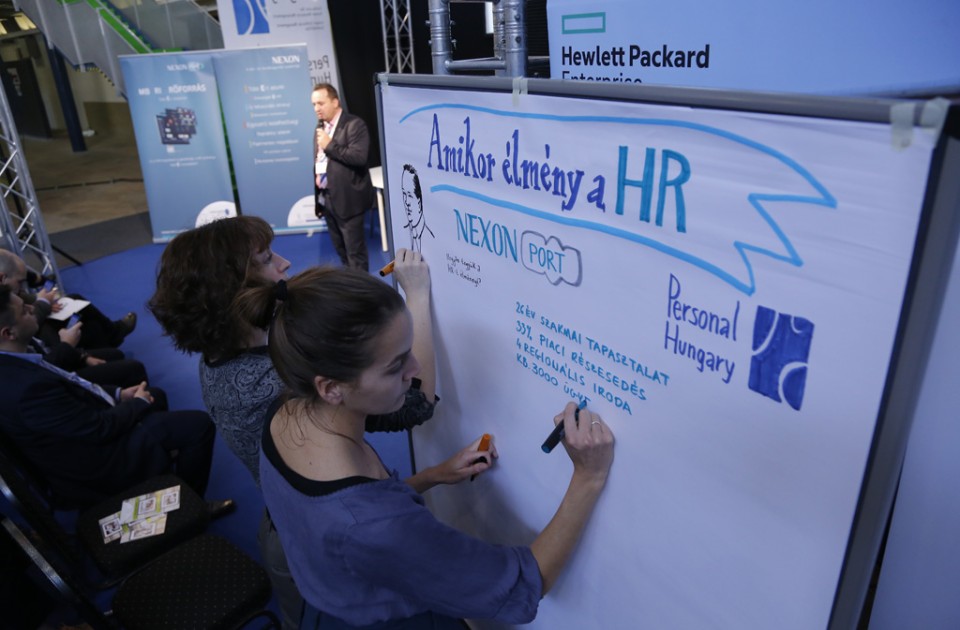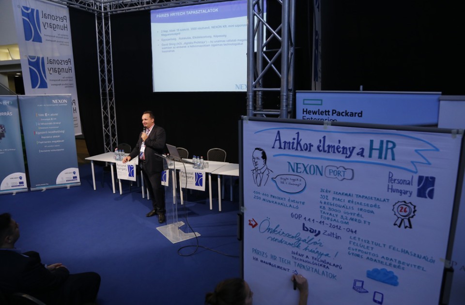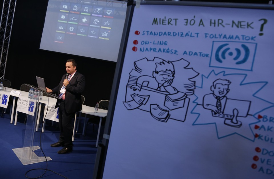 A második napon, Hunyady Lajos Értékesítési menedzserünk interaktív bemutatón keresztül mutatta be szoftverünket, amelynek legfontosabb üzenetei: mobilitás, felhasználói élmény, korszerű HR eszköztár. Az előadást grafikus jegyzetelés kísérte, amely új felfogásban foglalta össze mindazt, amelyről aznap szólt kollégánk prezentációja.